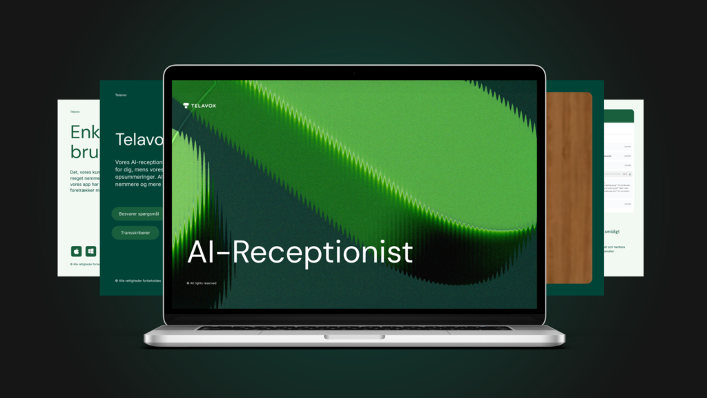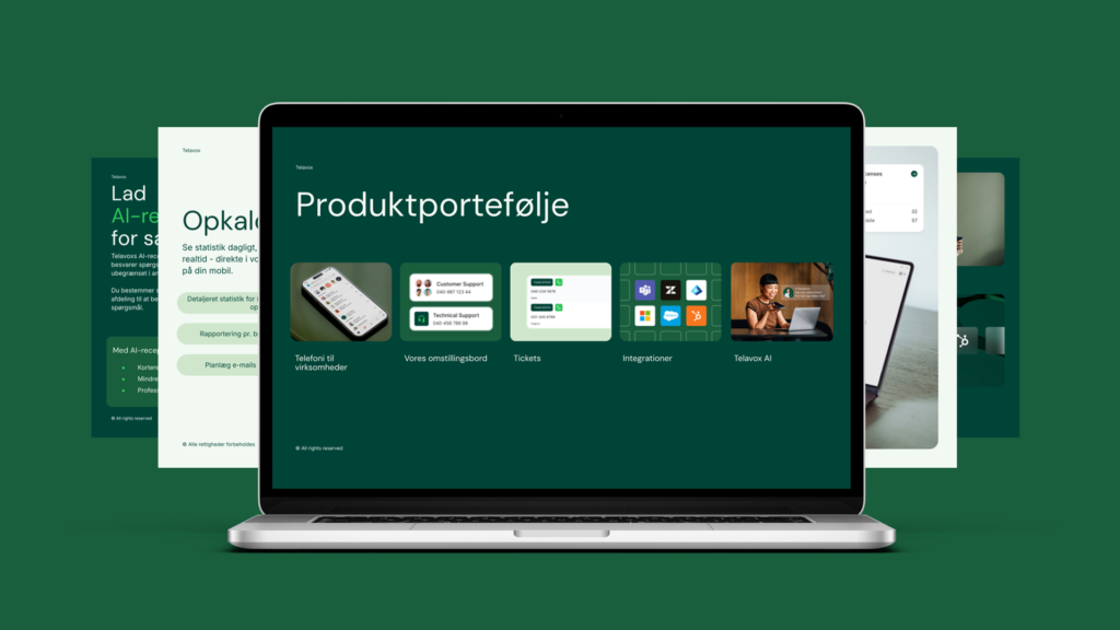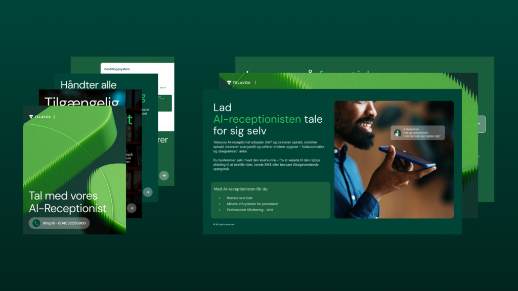 Komplet pakke med præsentation, produktark, kundecase, demo, video, billeder og SoMe-materiale til at beskrive værdien af AI-receptionisten.