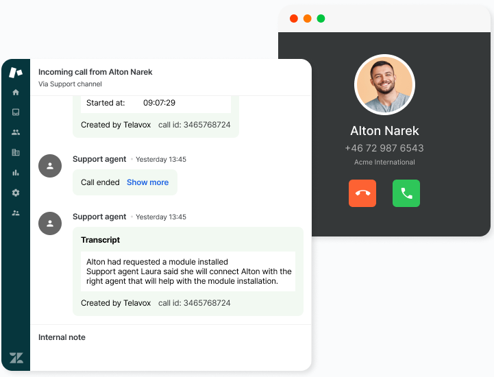 Alle opkald, du håndterer i Telavox, linkes automatisk til den korrekte kontakt i Zendesk. Det giver dig øjeblikkelig adgang til kundens komplette historik, mulighed for at registrere opkaldsnotater og et klart overblik over igangværende sager og muligheder. Dette effektiviserer både din opfølgning og det løbende kundeservicearbejde.