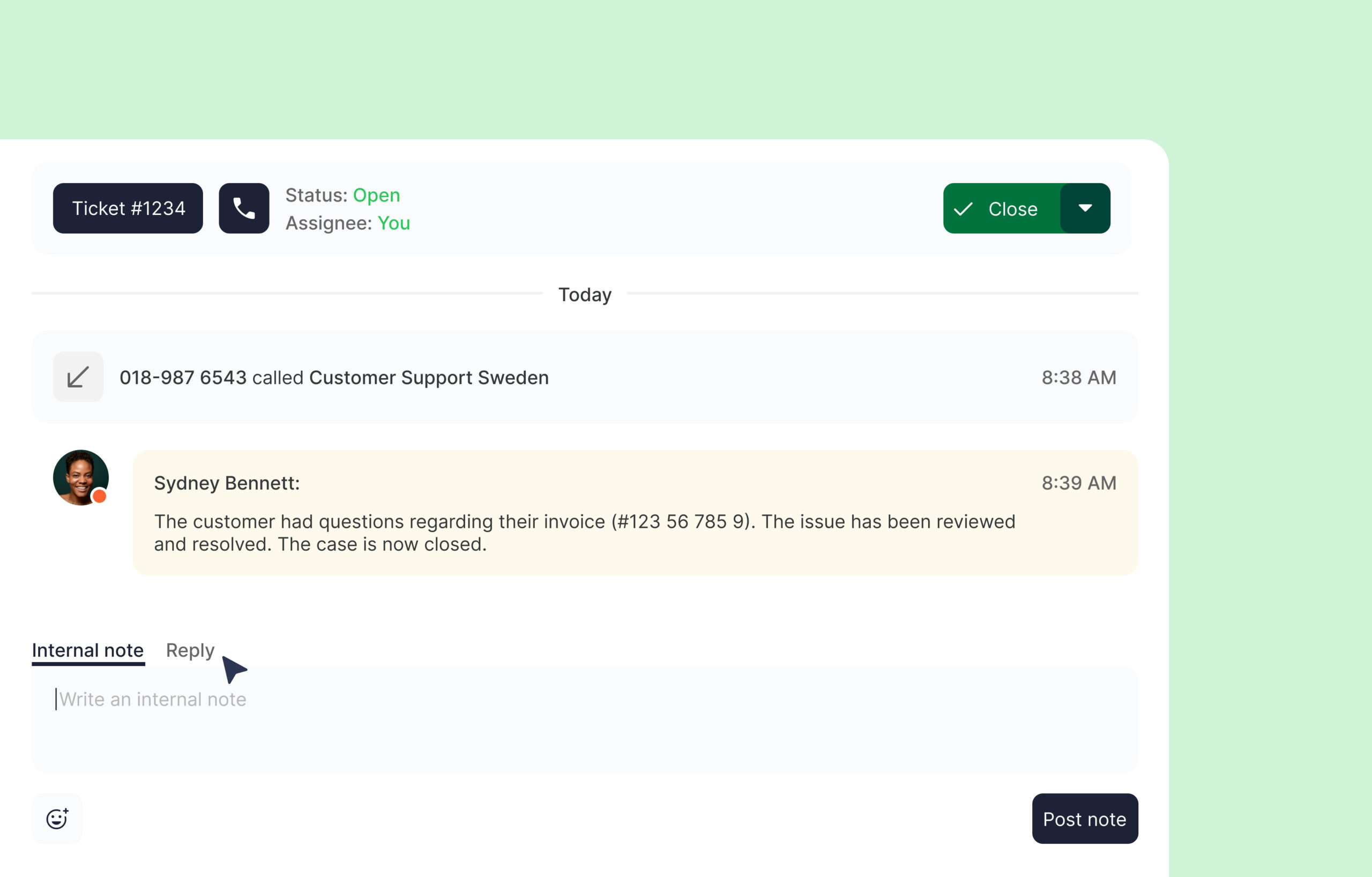 Når du håndterer indgående opkald kan du med vores indbyggede ticketingsystem nemt holde styr på alle kundesager, fra første opkald til afslutning.